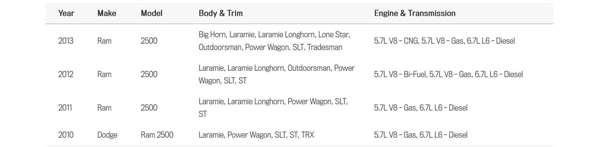 • Compatible with 2010-2013 Dodge Ram 2500 Models: Designed specifically for 5.7L and 6.7L engines.