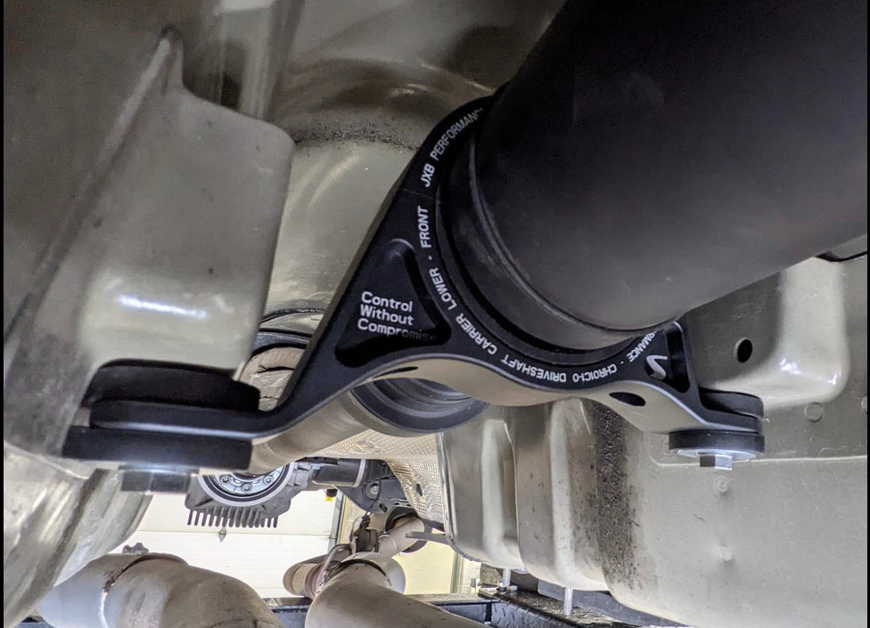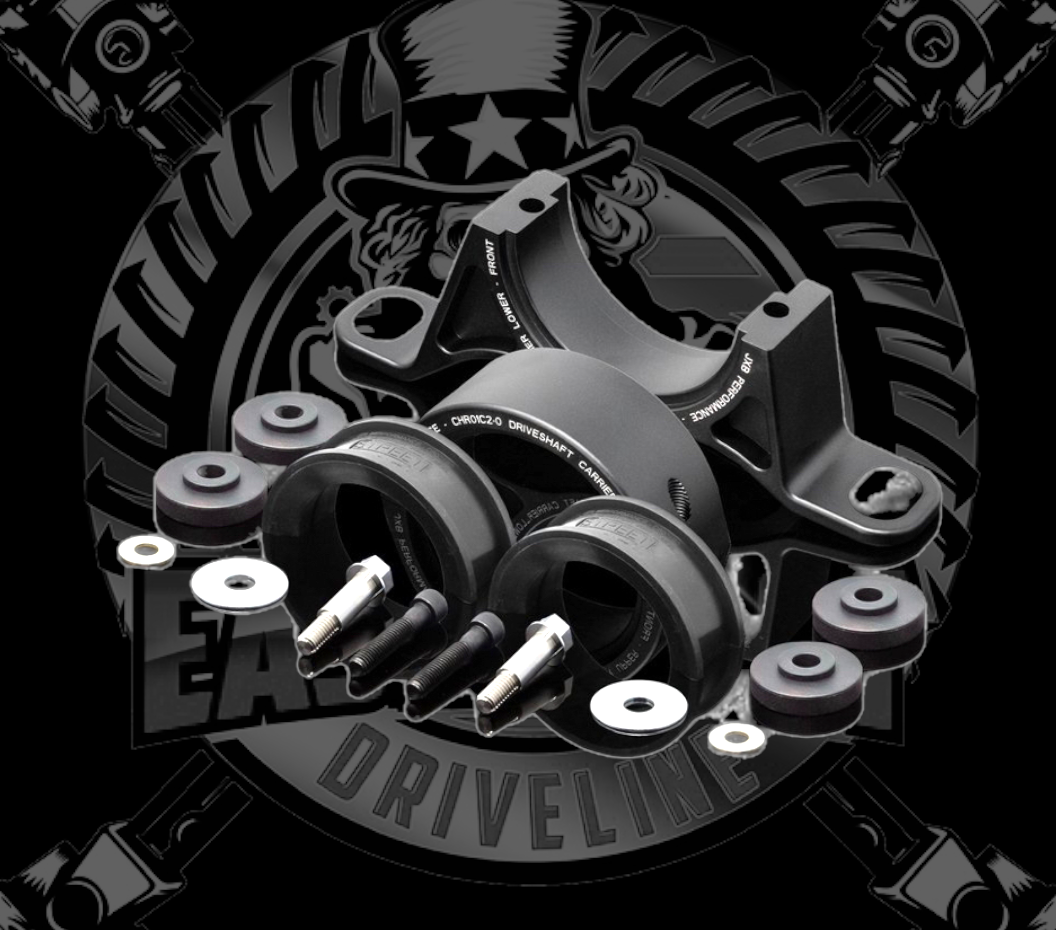 The stock center support bearing carrier is permanently molded to the center bearing with thin rubber that sags and cracks over time and does not adequately support the driveshaft under load. This rubber generally fails long before the bearing itself has reached the end of its life. Since the center bearing is molded to the OEM carrier and difficult to service, it’s often easier to get a new driveshaft than replace the center support bearing.