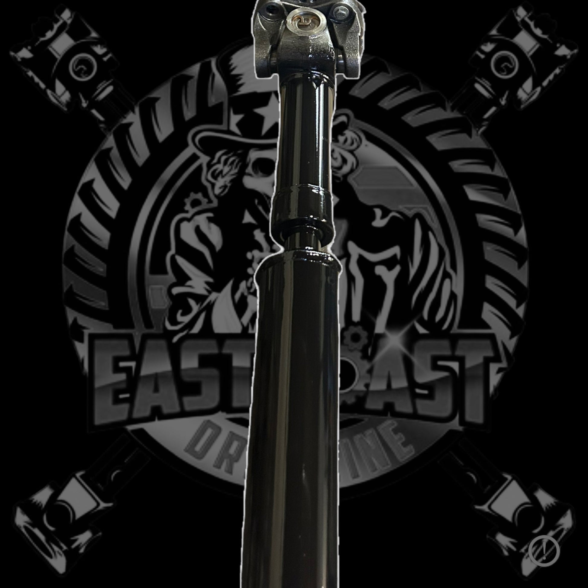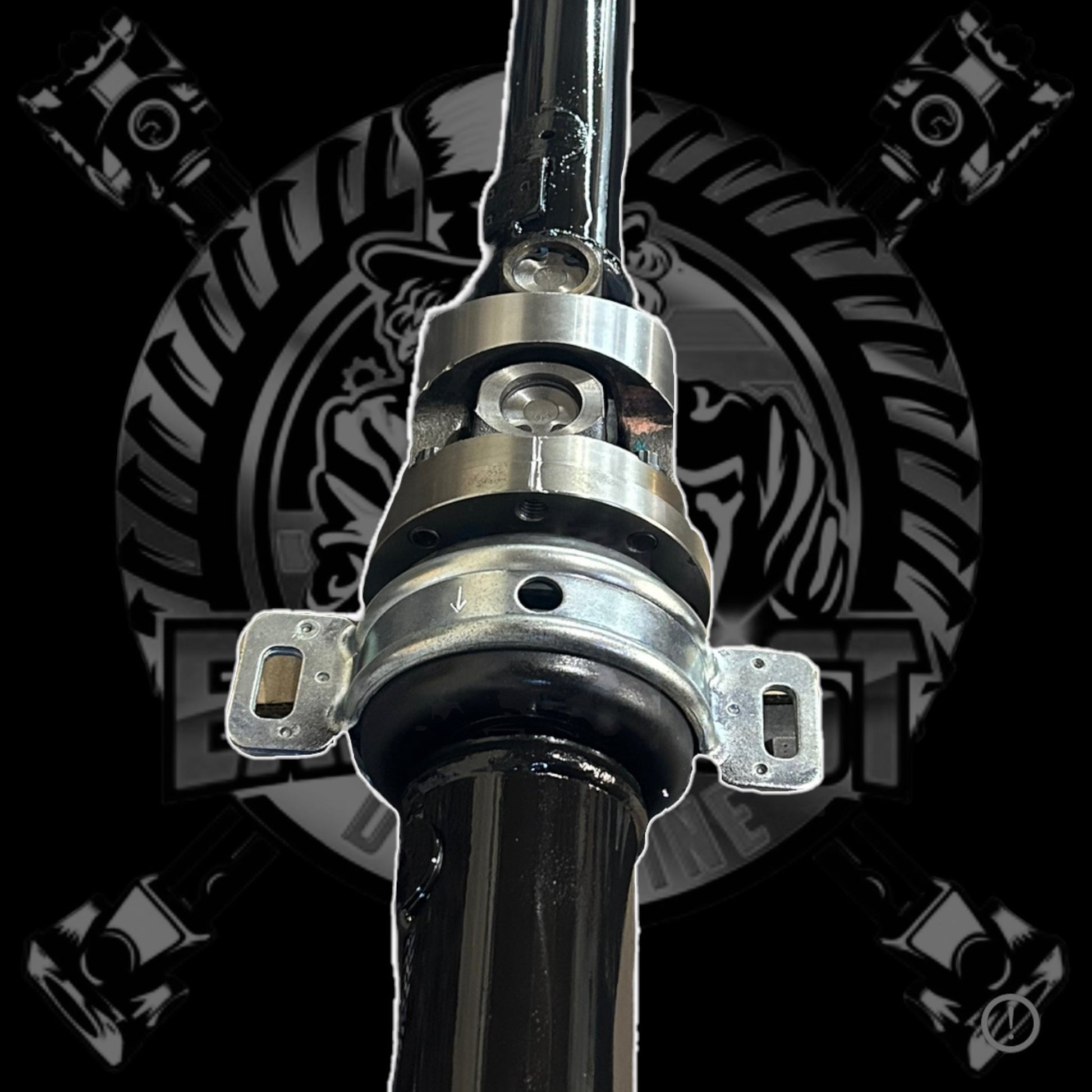Complete new Rear 2 piece Driveshaft assembly made with heavy duty parts and solid u-joints.