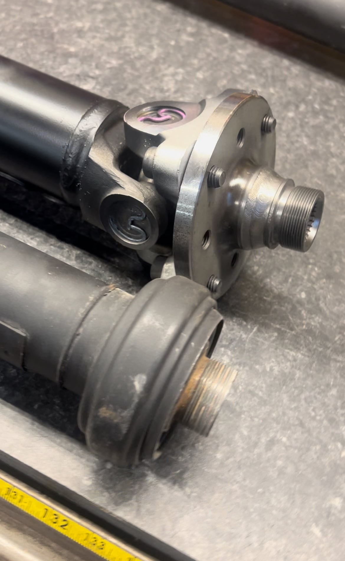**Aluminum driveshaft made with 3.5”x .125” Tubing, solid 1350 Series U-Joints and Billet Aluminum Flange Yokes with 110mm Front coupler delete Adapter. Custom Made 27 spline Differential Adapter with spline and threads.