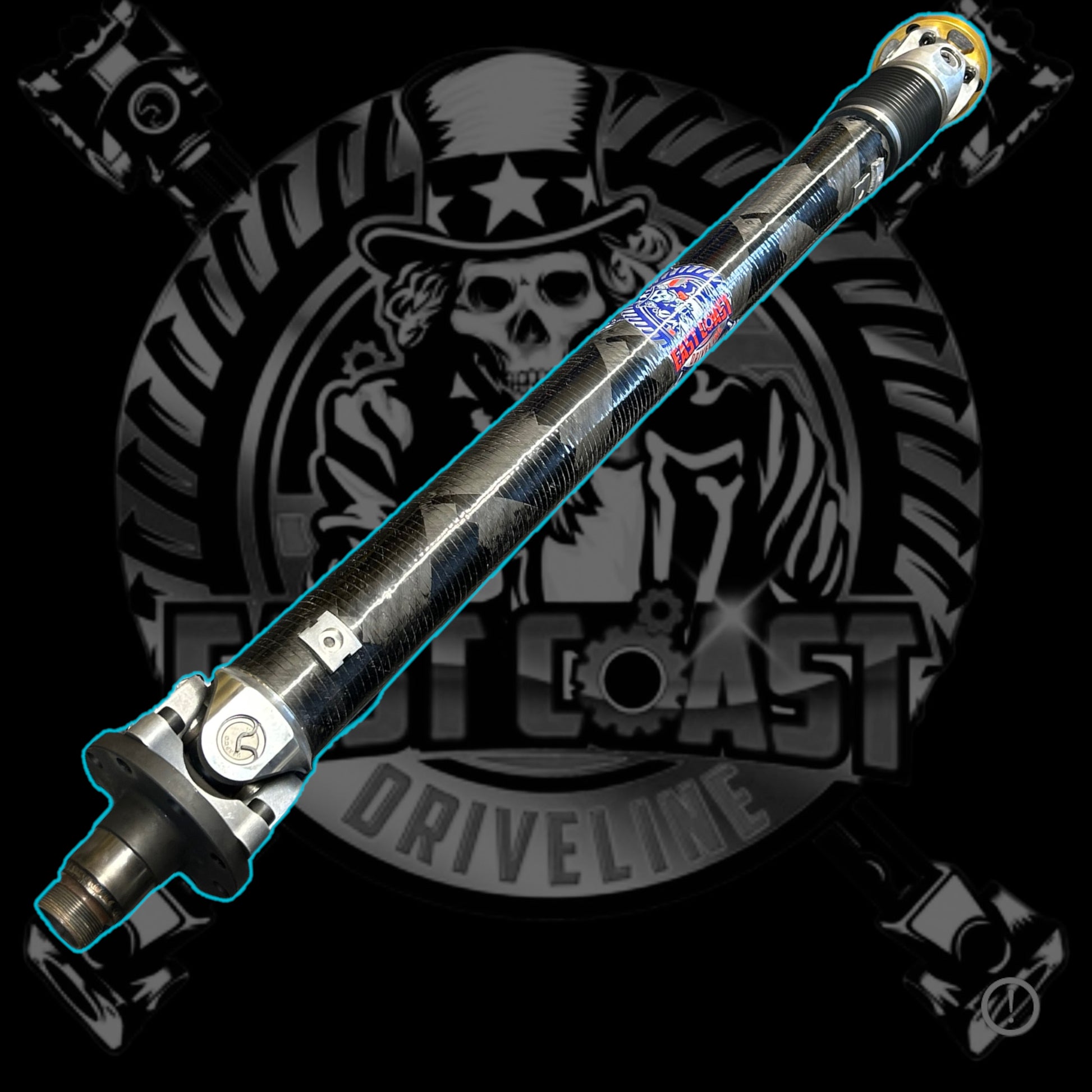 **Carbon Fiber driveshaft made with 3”ID x .125 or .155” wall Tubing, solid 1350 Series U-Joints and Billet Aluminum Flange Yokes with 110mm Front coupler delete Adapter. Custom Made Differential Adapter with 27 spline and threads.