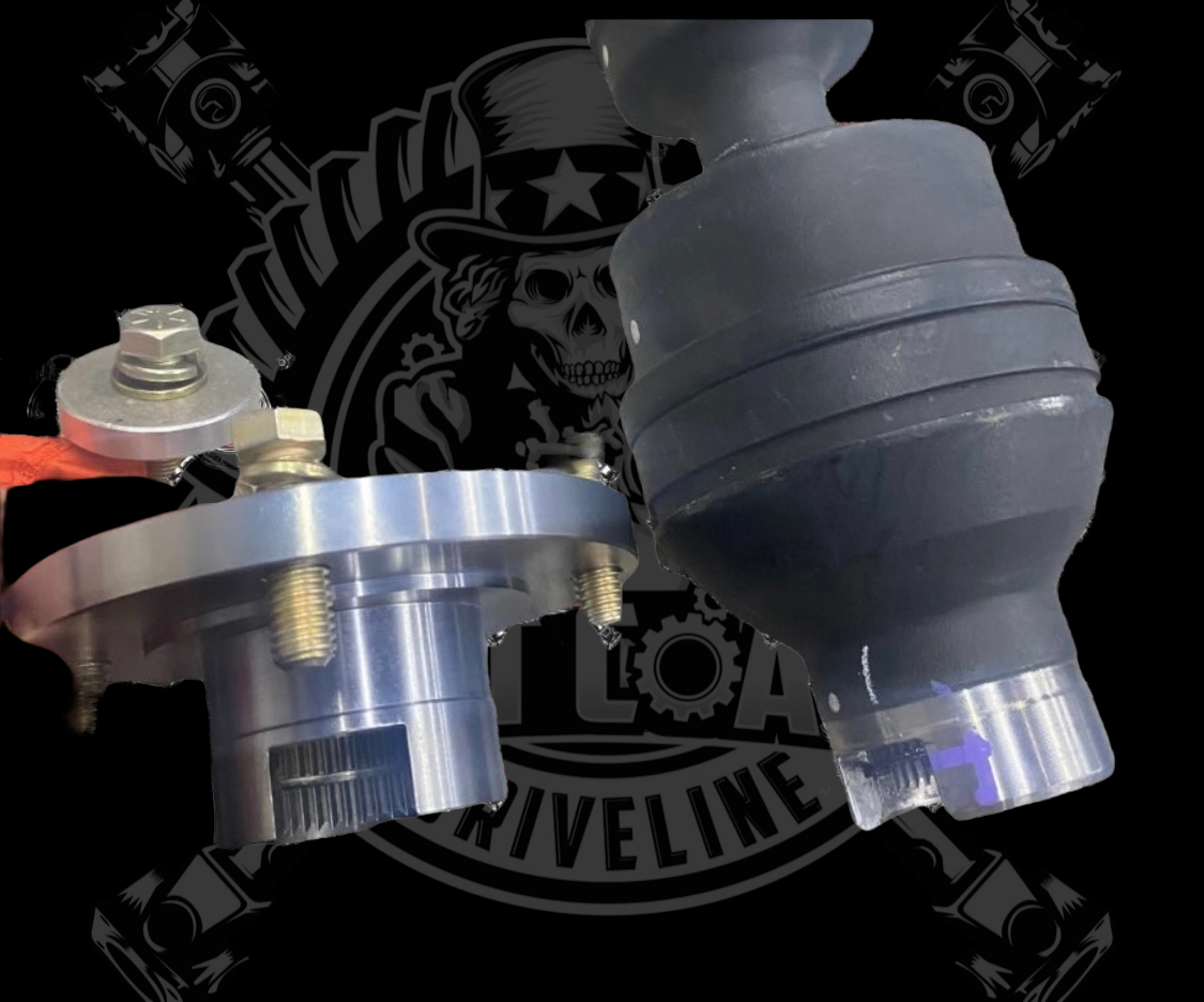 Driveshaft made with a high angle 1410 or 1350 double Cardan that mates to the new conversion flange yoke. Heavy Duty 2.50”x.125” or 2.50”x.095”Tubing and HD Solid U-Joints.