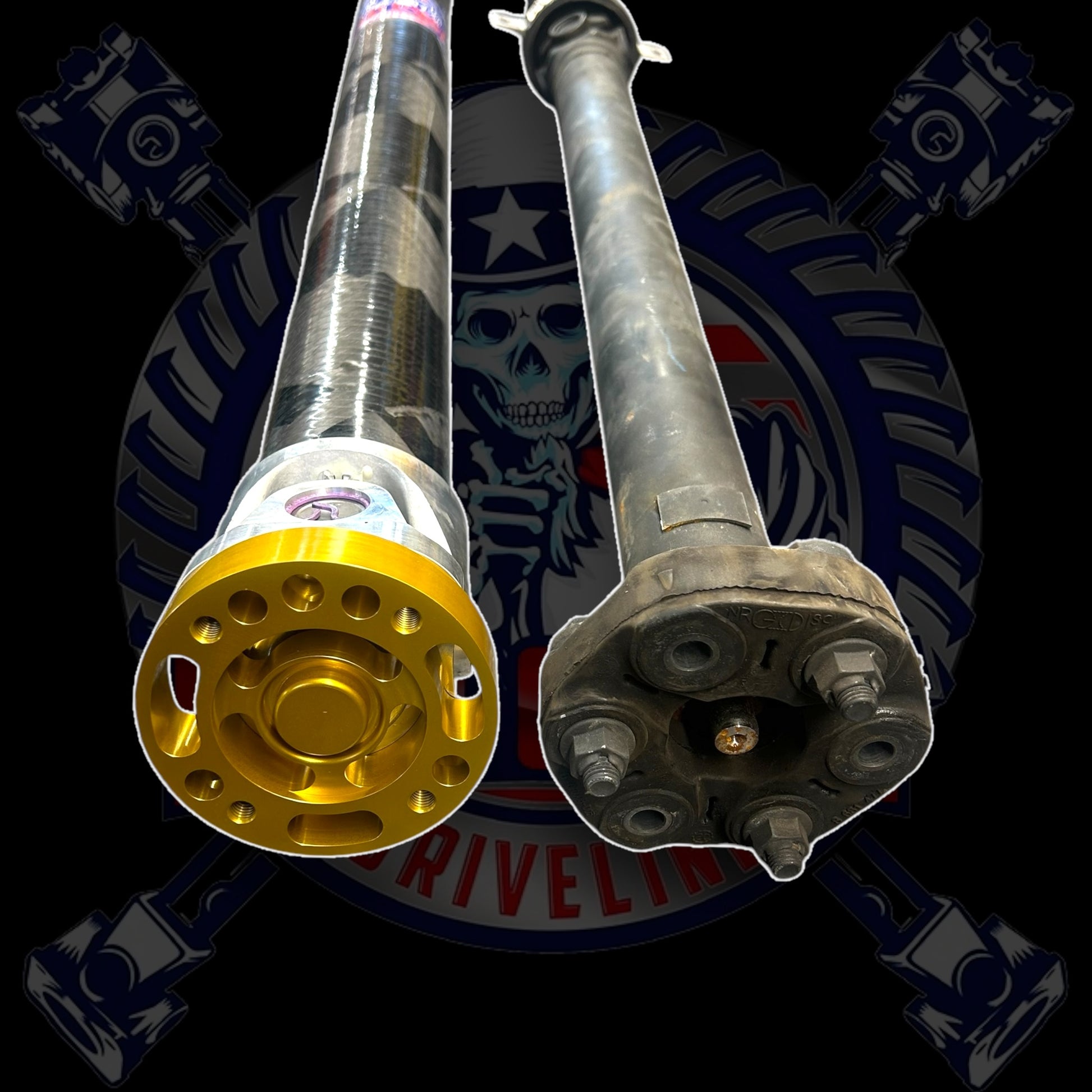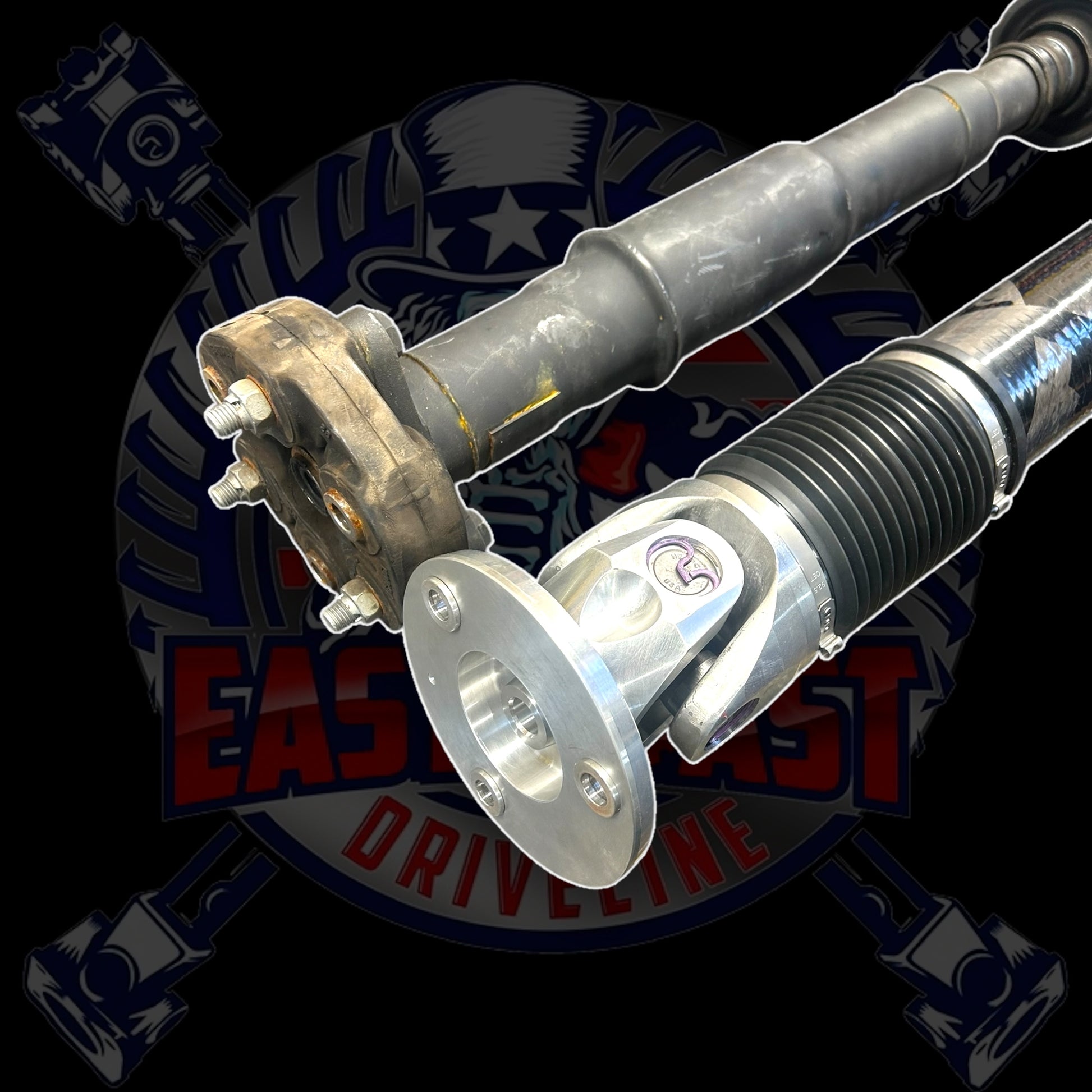 Much Stronger and Flexible Racing Style Driveshaft made to withstand high torque and horsepower. (Gets rid if the weak Rubber Coupler on Transmission, no more hanger bearing, Strengthens and coverts the Rear CVJ to aHD Flange and U-Joint Setup. May cause slight vibrations going from a 2 piece to a 1 Piece Driveshaft.