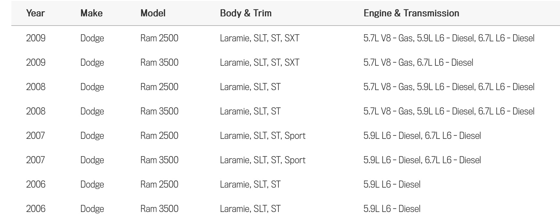• Direct replacement for 2006-2009 Dodge Ram 2500/3500 models